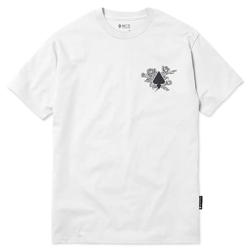 Camiseta MCD feita em malha penteada 30.1, com estampa na parte frontal e etiquetas personalizadas.