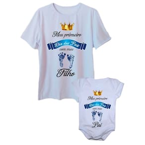 Camiseta Meu Primeiro Dia Dos Pais e Body Bebê Pezinho Azul Papai Tamanho Plus Size - Branco - G2