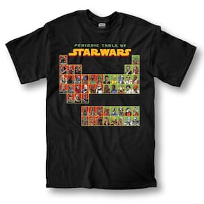 Eu me pergunto onde você encontraria midichlorianos em uma tabela periódica de elementos? Onde quer que esteja, você pode pelo menos encontrar alguns de seus personagens favoritos de uma galáxia muito, muito distante nesta camiseta oficialmente licenciada de Star Wars! Com uma tabela periódica repleta de alguns dos rostos mais memoráveis da história da franquia, essa camiseta da Tabela Periódica de Star Wars certamente agradará a quase todos os fãs.