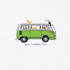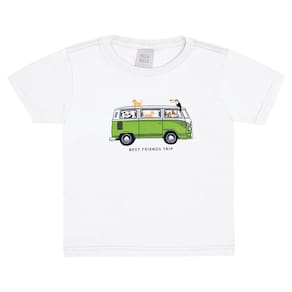 Para brincar com os amiguinhos durante os dias quentes nada como um lookinho super leve e fresquinho para acompanhar a energia dos pequenos. Camiseta em meia malha na cor branca com estampa de kombi com escrita "Viagem de melhores amigos. Aventura até o fim".