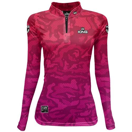 CAMISETA DE PESCA KING BRASIL COM PROTECAO SOLAR UV 50+ (KFF614) - FEMININA \nCamisa com proteção Solar, Tamanhos P ao GG \nProtege a Pele dos Efeitos nocivos do Sol \nUv protection e o fio inteligente que protege sua pele da ação dos raios UV-A e UV-B com fator de proteção solar de 30+ a 50+. \nPara os mais exigentes, as camisas da King Brasil com proteção UV protegem a pele durante a exposição ao sol com maior conforto e funcionalidade. \nDevido a modificações no DNA do fio, essa funcionalidade tem ação prolongada durante toda vida útil do produto. \nE a alta tecnologia e segurança que você sente na pele. \n- 100% poliéster\n- Proteção Solar UV\n- Impressão é feita em papel Epson de alta qualidade durável toda vida útil do produto.\n- Gola padre\n- Corte raglã\n- Tecido Tecno Dry Fit \n- Tecnologia de alta Absorção\n- Tecido leve\n- Conforto Térmico\n