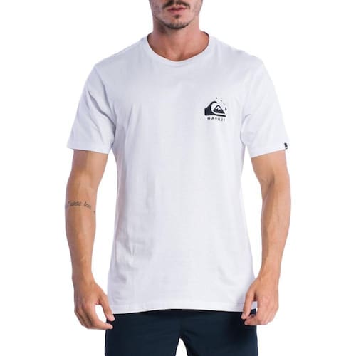 Camiseta Quiksilver básica, tecido em meia malha 30/1 fio cardada, silk frontal e traseiro, etiqueta localizada na manga e etiquetas personalizadas.