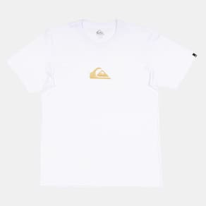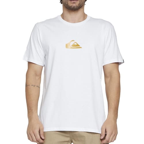 Camiseta QuikSilver feita em meia malha, silk metalizado em relevo centralizado na frente com 1 cor e etiqueta aplicada na manga esquerda de quem veste.