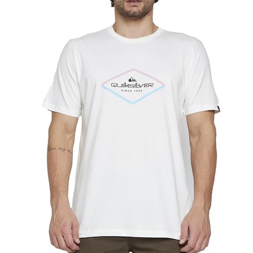 Camiseta QuikSilver feita em meia malha, modelagem regular fit, silk centralizado na frente com 3 cores e etiqueta aplicada na manga esquerda de quem veste.