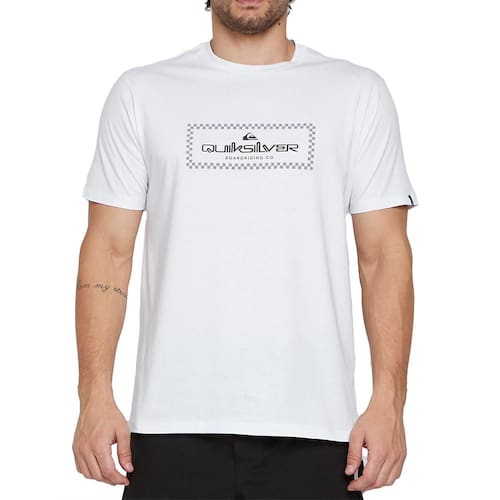 Camiseta QuikSilver feita em modelagem regular fit, meia malha, silk centralizado na frente com 2 cores e etiqueta aplicada na manga esquerda de quem veste.