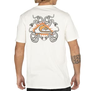 Camiseta QuikSilver feita em modelagem regular, meia malha, estampa da largura do tórax na frente e etiqueta aplicada na manga do lado esquerdo de quem veste.
