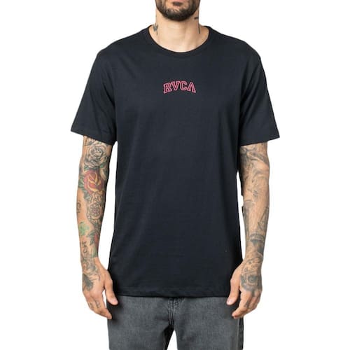 Camiseta RVCA manga curta meia malha 30.1 de algodão, modelagem regular, estampa silk logo puff RVCA na frente e etiquetas personalizadas.