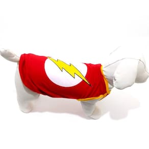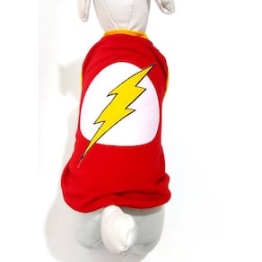 Camiseta confeccionadas em tecido de malha PV vermelha; Acabamento em cotton amarelo; Silkada na estampa do Flash; Tamanho: G; Medidas aproximadas: 37 cm de comprimento, 50 cm de circunferência torax, 30 cm pescoço; Ideal para filhotes ou cachorros/gatos de pequeno porte; Deixando seu Pet na moda com o seu Super heróis favorito. Marca: Não Informado