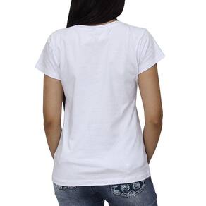 Camiseta feminina Wrangler fabricada em tecido 100% Algodão na cor Branca, possui mangas curtas, gola tradicional e estampa na parte frontal.