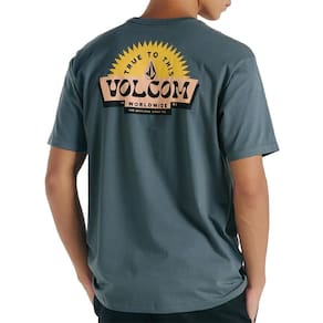Camiseta Volcom feita em modelagem regular, meia malha 30.1, silk frente e costas, assinatura Volcom na manga, etiqueta volcom e viés contrastante.