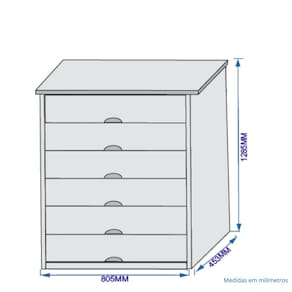 Características: 6 Gavetas Corrediças telescópicas Estrutura em MDF/MDP 15 e 25mm Fundos em HDF 3mm Gavetas suportam 5kg Tampo suporta 20kg Possui sapatas em L Puxadores embutidos
