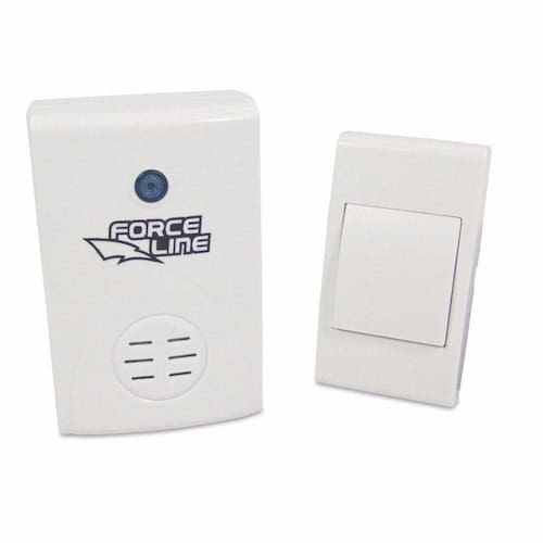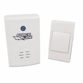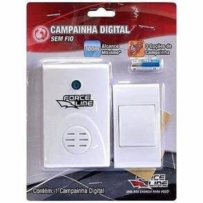 Campainha Digital sem fio Force Line - Alta eficiência, - Baixo consumo da pilha, - 36 opções de campainha, - Design moderno e arrojado, - Muito simples de instalar, - Não requer nenhuma ligação elétrica. Certificada pela Anatel - Nº Homologação: 0973-08-1924. Importante: Não é aconselhável a instalação sobre uma superfície metálica, pois o alcance pode ser prejudicado (reduzido consideravelmente) ou até mesmo fazer com que ela não funcione. * Quando o som da campainha estiver fraco, aconselhamos a troca das pilhas AA,* Quando a sensibilidade do sensor estiver fraca, aconselhamos a troca da bateria de 12V. Mais Informações - O botão acionador utiliza 1 bateria de 12V modelo 23A (inclusa), - O utiliza 2 pilhas de 1,5V tipo AA (não inclusa), - Ótimo funcionamento com distância de até 100 metros (em área livre), - Para uso em ambiente interno, livre de chuva, umidade e sol, - Frequências (RF): 316, 322 e 328MHz.- Frequência: 760Hz e 1000Hz, - Frequência variável alternadamente entre som grave e agudo,Intermitência: 1 a 3 vezes por segundo,Intensidade: >75dB (c/ pilhas recarregáveis),>81dB (c/ pilhas comuns ou alcalinas), Autonomia:Pilhas normais - 1 mês (10 acionamentos por dia),Pilhas alcalinas - 2 meses (10 acionamentos por dia), Acessórios: Parafuso e bucha para fixação na parede não estão inclusos na embalagem.