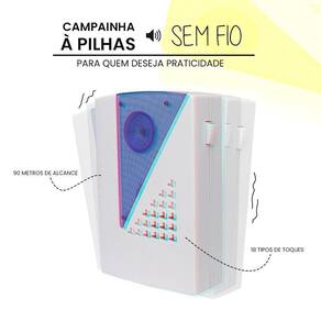 A campainha sem fio possui um LED azul e é muito simples e fácil de instalar. Feita para evitar interferência, possui ótima qualidade de som e lindo design e permite um alcance de até 0 metros em espaços abertos. - Diferenciais: Transmissor Resistente; Raio de Alcance de até 90 Metros em Espaços Abertos; Não requer Fios para Instalação; Transmissor utiliza apenas 01 Pilha 12V 23A Já Inclusa ; Campainha utiliza 02 pilhas AA 1.5V Não inclusas ; Fácil de Instalar e não compromete a decoração interior. ESPECIFICAÇÕES: Material: PVC e Componentes Eletrônicos Dimensões: -: 8cm x 4,5cm x 1,5cm -Campainha: 10cm x 6,5cm x 2,5cm Cor: Branco e Azul Contém: Campainha Residencial Wireless Sem Fio Resistente Água Wifi Marca: Não Informado Ean: 7908281313952