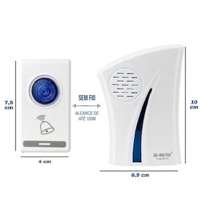Campainha Sem Fio - Longo Alcance - B-max Unica Campainha Sem Fio - Longo Alcance - B-max A campainha sem fio de Longo Alcance B-Max é a solução mais moderna, prática e versátil. Com funcionamento por meio de tomadas e pilhas podem ser instaladas em diferentes lugares sem dificuldade. Possuindo 38 toques, sistema de economia de energia, longa distância de operação e alimentação do botão transmissor: 1 bateria 12V 23A (igual a de controle de portão). Alimentação do botão transmissor: 1 bateria 12V 23A (igual a de controle de portão). Código Interno: 100121 Dimensões aprox. da embalagem em cm: 4x15x23 Peso liq. Aproximado do produto na embalagem: 110g Referência do Modelo: BM-604 Conteúdo da Embalagem: 01 par de campainha sem fio : : 90 dias contra defeitos de fabricação pelo fabricante Imagens meramente ilustrativas. As cores e tonalidades podem variar. Material - ABS