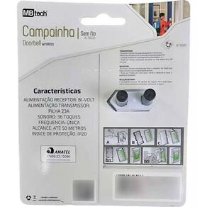 Campainha Sem Fio Wireless Casa Apartamento Escritório MBTEC Campainha Sem Fio - Doorbell Wireless Transforme a experiência de receber visitas com a nossa Campainha Sem Fio Com 36 toques diferentes, você pode personalizar o som da sua campainha conforme o seu gosto. Características: Transmissor: Escolha o melhor local para fixação, remova a tampa com uma chave pequena e coloque as baterias respeitando as polaridades. Pode ser fixado com parafuso ou fita dupla-face inclusa . : Plugue em uma tomada visível para garantir a melhor qualidade de som. Pode ser fixado em uma peça móvel para deslocamento conforme necessário. Seleção de Sons: 36 opções de toques para personalizar o som da sua campainha. Utilize a chave seletora na base do para escolher. Especificações: Alimentação : Bi-volt Alimentação Transmissor: Pilha 23A Sonoro: 36 toques Frequência: Única Alcance: Até 50 metros Índice de Proteção: IP20 Homologação: ANATEL, Produto Homologado 17499-22-12086 Garanta já a sua Campainha Sem Fio e leve praticidade e estilo para a sua casa Nota: Produto homologado pela ANATEL, garantindo qualidade e segurança.