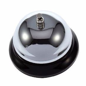 Campainha mesa para recepção pizzaria hotel cem porcento metal descrição: feito em metal inox e base em metal preto tamanho: 8,5 cm diâmetro x 5 cm altura funcionamento: manual