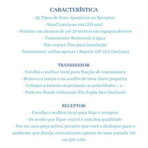 ficha técnica: transmissor controle comprimento 9 cm largura 6 cm altura 2,5 cm capacidade de alcance de 30 metros em campo aberto campainha comprimento 8 cm largura 4,5 cm altura 2 cm bivolt - 110/220 volts botão lateral para alternar entre as 32 opções de toques