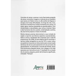 Cancelas do tempo: poemas é uma fascinante projeção de cenas, momentos, imagens e vivências de um brasileiro que nasceu em Natal, morou no alto sertão de Alagoas e escapou de muitas dificuldades. Ao longo da vida, viveu, escreveu e transformou muitos momentos em versos, os quais, agora, resolveu apresentar ao grande público. Com simplicidade e naturalidade, seus versos mostram fatos e atos humanos de amor, paixão, contemplação e sonhos, de uma forma própria e muito envolvente. Muitos desses poemas demonstram a sua vontade de captar e reportar aos leitores aspectos surpreendentes, belos e únicos, resultantes das surpresas que a vida lhe proporciona. Em 2008, 35 anos depois de ter concluído o serviço militar obrigatório no ano de 1973, o autor voltou ao quartel em busca de um documento para comprovação de tempo de serviço para apresentar em seu processo de aposentadoria. Ao atravessar a cance-la de entrada, sentiu forte lembrança daquele tempo, dos colegas e do chão que pisou por cerca de um ano. O resultado foi a criação de um poema, pequeno, porém de fortíssimo significado, intitulado “Tempos”. Marca: ARTERA EDITORA
