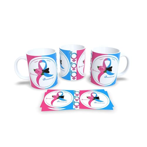 Caneca personalizada de porcelana de alto brilho, com interior e Alça Branca Coleção Outubro Rosa e Novembro Azul.