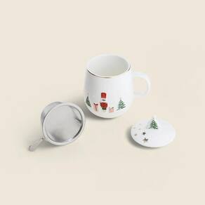Aqueça seus momentos com a delicadeza da Caneca Magic. Feita em porcelana de alta qualidade, ela traz um design festivo encantador com ilustrações natalinas como quebra-nozes, árvores decoradas e presentes, em tons vibrantes sobre fundo branco com detalhes dourados que lembram flocos de neve. A tampa com estrelas douradas ajuda a manter a bebida quente, enquanto o filtro metálico é ideal para preparar chás com folhas soltas, tornando cada pausa ainda mais especial.