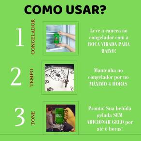 Modo de Uso Simples: Coloque a caneca no freezer sempre com a boca para baixo. Deixe lá por no máximo 4 horas.
