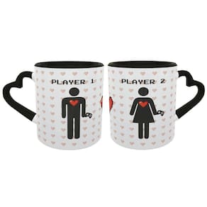Caneca Coração Casal Player 1 e 2 HxM Presente Namorados Cor: Preto A Caneca Coração Casal Player 1 e 2 HxM é um lindo presente para o seu namorado ou namorada geek, que são fãs de vídeo game. Linda opção de presentes criativos geek para todos os nerds apaixonados Confira nossas lindas opções de canecas divertidas para decorar a sua cozinha geek. CARACTERÍSTICAS - Canecas de Cerâmica com alça coração que pode se esquentar o liquido no micro-ondas; - Produto pode ser lavado em máquina de lavar com água quente que a estampa não sai; - Recomendação não passar o lado áspero da esponja; - Caneca cerâmica branca; - Capacidade 325 ml; - Diâmetro de 8 centímetros; - Altura de 9,5 centímetros. Marca: Não Informado Ean: 7898711271894
