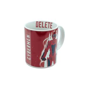 - A caneca de cerâmica apresenta uma imagem de um Cyberman do lado de fora com o texto "DELETE" ao longo do aro interno.