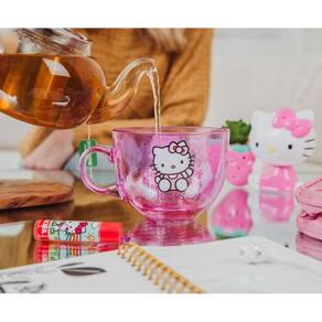 - SANRIO HELLO KITTY: Caneca de vidro roxo apresenta Hello Kitty em uma pose adorável. Escrito atrás dela está "Hello Kitty" em um design gradiente. Este design é colocado em ambos os lados da caneca de vidro.