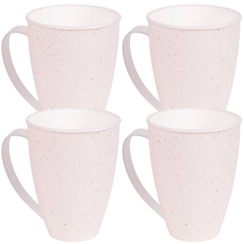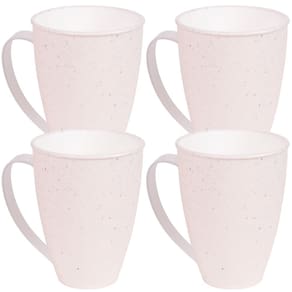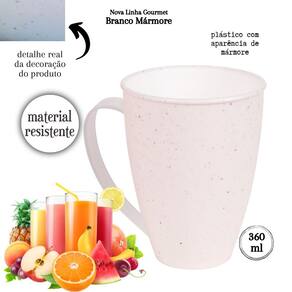 Conjunto com 4 unidades. Caneca de plástico alça para servir água, suco, refrigerante, chá, café, com decoração predominantemente branca com leves traços/ranhuras pretas por toda a peça, que traz uma aparência marmorizada super requintada ao produto.