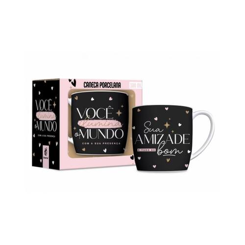 Com capacidade para 300ml, é feita na cores rosa, preta e branca, ela conta com uma linda frase, "Sua amizade é tudo de bom.", de um lado e do outro, "Você ilumina o mundo, com sua presença.", que agrega ainda mais beleza a peça.