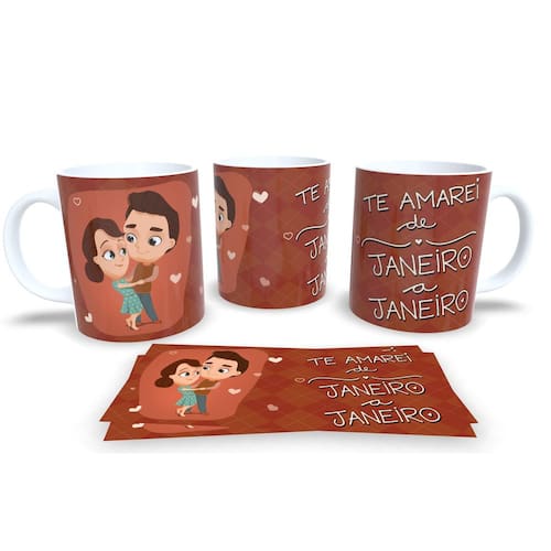 Caneca personalizada de porcelana de alto brilho, com interior e Alça Branca Coleção Flork Namorados.