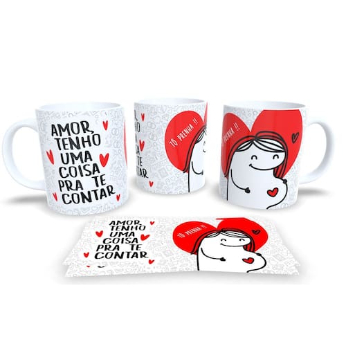 Caneca personalizada de porcelana de alto brilho, com interior e Alça Branca Coleção Flork Namorados.