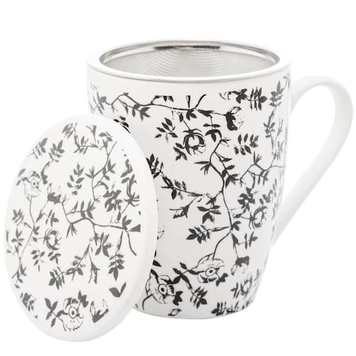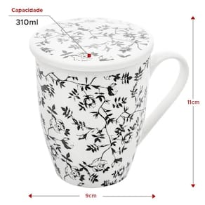 Caneca de Porcelana com Tampa e Filtro Lyor Xícara de Chá 310ml Super White Tiny Flowers.
