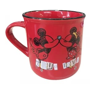Caneca de porcelana em um vermelho intenso, estampada com Mickey e Minnie se beijando, em uma demonstração de "True Love" (amor verdadeiro). Arte em estilo grafite. Material: porcelana; Litragem: 280 ml