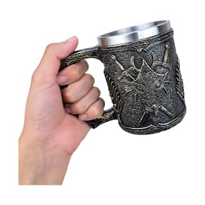 Caneca Dragão Espada Escudo de Resina Ideal para os amantes de dragões e da época medieval, esta caneca de resina é uma verdadeira obra de arte. Com um design em 3D que destaca um dragão imponente, é perfeita para apreciar sua bebida favorita com muito estilo. A cor preta com detalhes dourados dá um toque de elegância à peça. Garanta já a sua caneca do Dragão para dar um toque mágico ao seu dia a dia