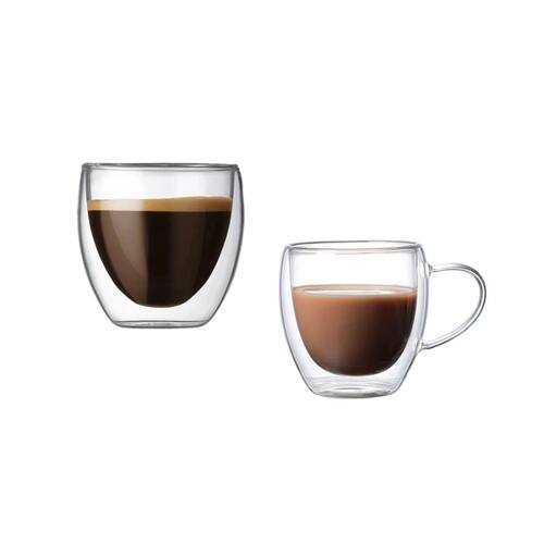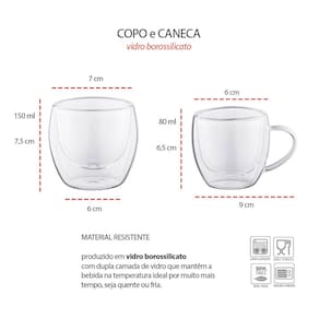 Contem: 1 Caneca de Vidro Capacidade: 80 ml Medidas: 9 x 6,5 cm 1 Copo de Vidro Capacidade: 150 ml Medidas: 7 x 7,5 cm Material: Vidro Borossilicato