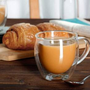Copo e caneca de vidro borossilicato dupla camada. O vidro borossilicato proporciona durabilidade e resistencia ao calor do microondas. E mantem a temperatura do liquido, seja fria ou quente, por mais tempo. Os copos e canecas de vidro borossilicato nao alteram o sabor e nem aroma das bebidas, perfeito para cappucinos, cafe, drinks e sucos.
