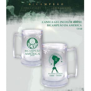 A conquista mais esperada pelo torcedor do Palmeiras agora eternizada nesta linda caneca em Gel BICAMPEÃO DA LIBERTADORES. Essa linda caneca, feita em acrílico, tem capacidade para 400 ml e conta com Gel congelante interno, que irá auxiliar a manter a temperatura gelada de sua bebida. Apresenta o gel na cor transparente, com o escudo do clube em destaque.