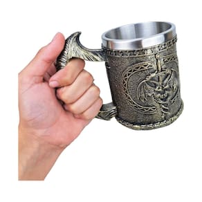 Caneca Espada 2 Dragões de Resina Essa caneca irada vai deixar suas manhãs mais épicas Com um design de dois dragões feito de resina, essa caneca cinza com detalhes dourados é perfeita para quem gosta de um toque de fantasia no dia a dia. Ideal para aquele cafezinho ou chá, vai dar um toque único à sua rotina. Não é indicado para micro-ondas nem lava-louças, então é melhor cuidar dela com carinho. Marca Tenda Medieval.