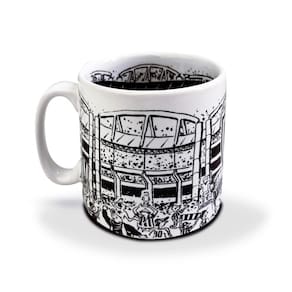 Esta caneca estádio simula o estádio em dia de jogo Na parte externa, a fachada, e na parte interna, a torcida. No campo de futebol, o momento exato em que o botafogo marca um golaço do adversário.