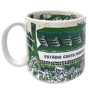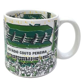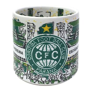 Esta caneca estádio simula o estádio couto pereira em dia de jogo Na parte externa, a fachada, e na parte interna, a torcida. No campo de futebol, o momento exato em que o coritiba marca um golaço do adversário.