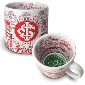 Esta caneca estádio simula o estádio do internacional em dia de jogo Na parte externa, a fachada, e na parte interna, a torcida. No campo de futebol, o momento exato em que o inter marca um golaço do adversário.