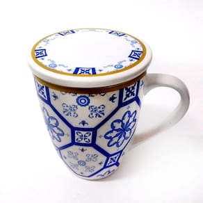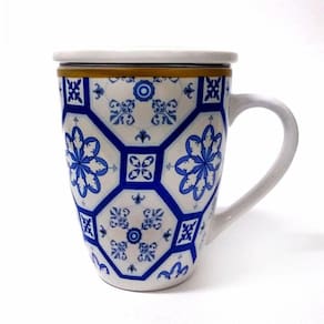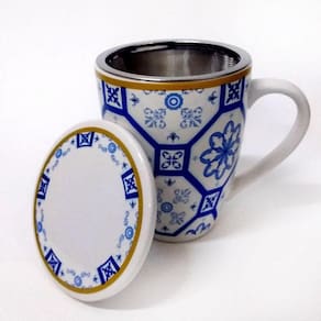 A caneca e a tampa são fabricadas em porcelana importada, na cor branca e ricamente decoradas com estampas de ladrilhos português na tradicional cor azul.