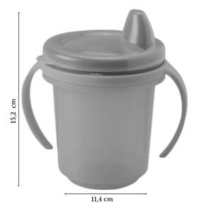 Caneca de Treinamento Decorada Dinossauros Baby com alça dupla, tampa de rosca e bico anatômico. Conta também com uma segunda tampa de sobreposição, que consiste em uma lâmina redonda de plástico incolor que se encaixa à tampa de rosca com objetivo de proteger o bico da caneca. A alça dupla, que é removível, fica fixada por compressão entre o copo principal e a tampa de rosca, já que seu design se resume em uma peça anelar única com duas saliências curvadas nas extremidades, que funcionam como pegadores. A resistência garante firmeza e transmite segurança aos bebês durante o período de transição da mamadeira para copos e canecas.