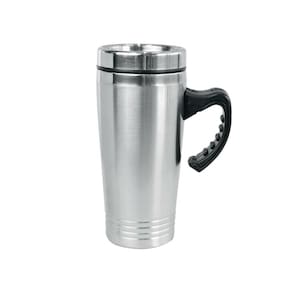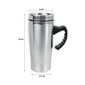 CANECA INOX COM TAMPA ALCA EM PLASTICO 450 ML -YN44 Caneca com alça e trava com vedação em silicone. Produto ideal para brindes, lembranças e de uso diário. Função isotérmica onde auxilia na permanência do líquido quente ou frio por até 02 horas. Informações Técnicas:Composição: Aço inox e PP.Altura: 18cm.Largura: 8cm.Diâmetro parte inferior: 6,5cm.Diâmetro parte superior: 8 cm.Peso: 238 gramas.