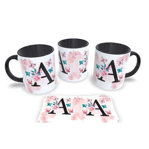 Caneca de porcelana de alto brilho, com alça e interior Preta Coleção Alfabeto Iniciais Nomes.
