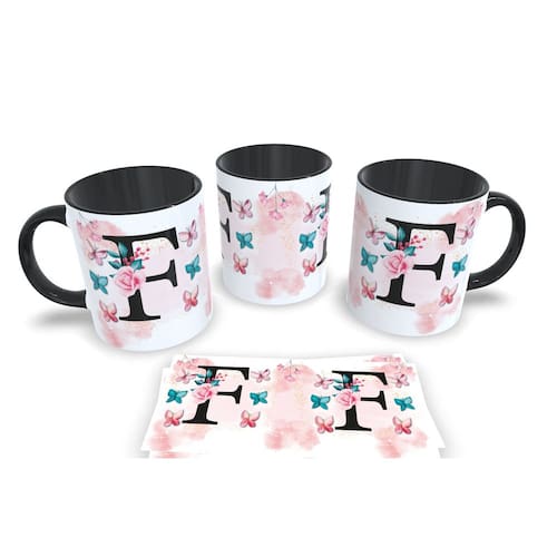Caneca de porcelana de alto brilho, com alça e interior Preta Coleção Alfabeto Iniciais Nomes.