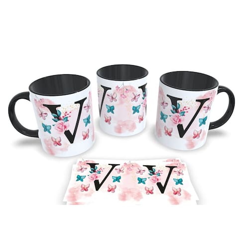Caneca de porcelana de alto brilho, com alça e interior Preta Coleção Alfabeto Iniciais Nomes.