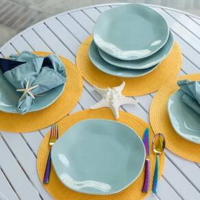 5. Qual é a cor das xícaras e canecas? R: As xícaras e canecas possuem uma linda cor azul claro, inspirada nas praias de Blue Bay.