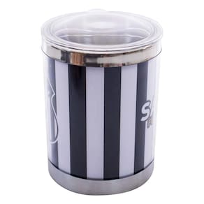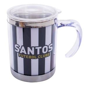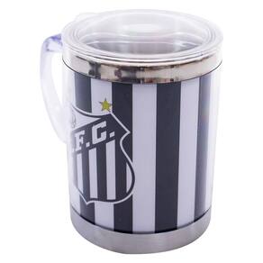 A caneca que é uma das mais favoritas de nossos clientes. A caneca vem com revestimento duplo de plástico no exterior. Entre as camadas uma folha toda customizada do Santos personaliza a caneca. Interior de inox permite manter a bebida gelada ou quente por muito mais tempo. Alça transparente em formato que facilita no uso. Vem com tampa para higienização. Material: plástico e inox; Litragem: 450 ml